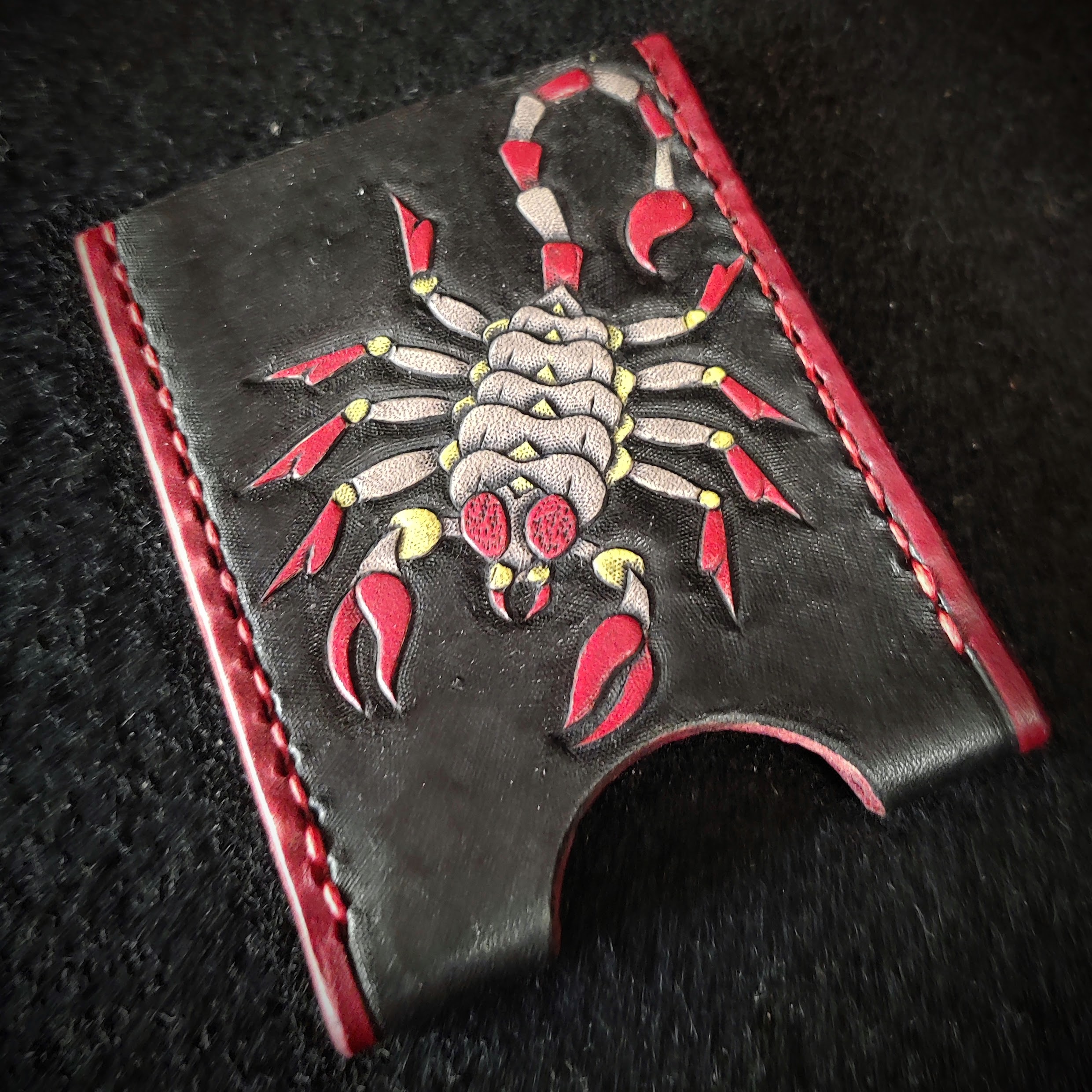 Crafted by hand at The Anvil Workshop, this one-of-a-kind leather card wallet combines traditional leather tooling with bold artistry. The front features a detailed hand-tooled and painted scorpion, symbolizing strength, resilience, and protection.